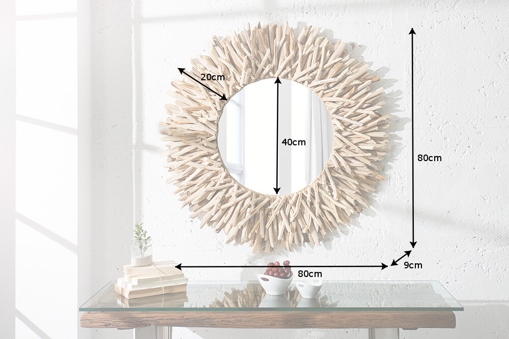 De hoogwaardige massief houten teakhouten spiegel is zonder twijfel een blikvanger. Individueel en perfect gepresenteerd straalt het de huidige trend naar natuurlijke materialen uit, vooral in grote ruimtes. Met een diameter van 80 cm is het het ideale woonaccessoire voor de laatste controle voordat je het huis verlaat. Puristisch helder en met vakmanschap vervaardigd, verrijkt deze spiegel uw natuurlijke sfeer, geïnspireerd op het origineel.