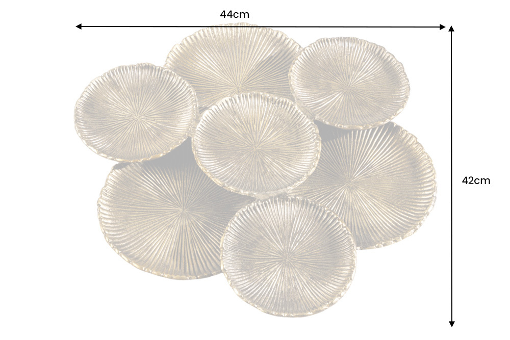 Deze decoratieve schaal is niet alleen een accessoire, maar een echt eerbetoon aan esthetiek en elegantie. De prachtige XXL-schaal van metaal-aluminiumlegering wordt gepresenteerd in glanzend goud en fascineert door zijn artistieke design. Het bijzondere bladpatroon, bestaande uit in totaal zeven kleine en grote schalen die op waterleliebladeren lijken, geeft dit decoratieve object een unieke expressiviteit. Het delicate vakmanschap en de metalen elegantie maken deze decoratieve schaal tot een echte blikvanger. Het glanzende goud reflecteert het licht en zet stralende accenten in je huis.