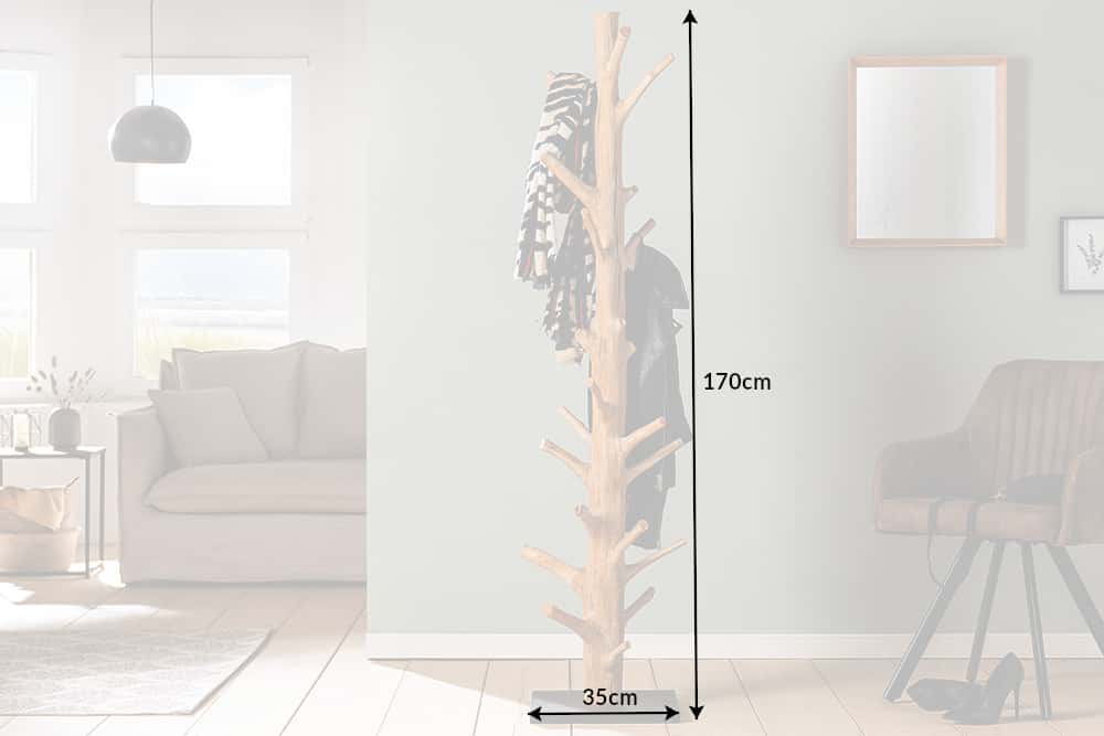 Het aantal en de positie van de kapstokhaken varieert per boomstam, afhankelijk van hoe de takken van de boom ooit groeiden. Een zware voet van gelakt rubberhout zorgt voor een veilige stand. Of het nu in de gang, in de slaapkamer of in uw kleedkamer is: de hoge kapstok van massief hout geeft elke kamer een natuurlijk, individueel tintje – ervaar het zelf.